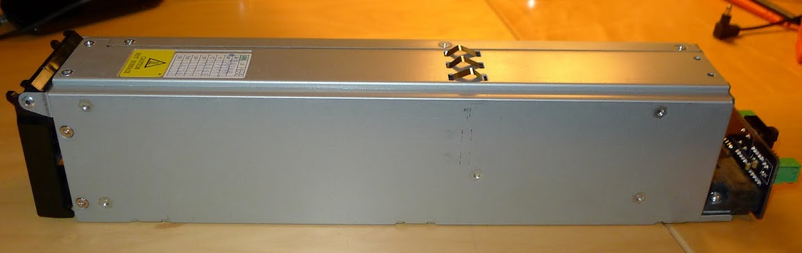 I acquired a couple and figured out how to turn the thing on by shorting 3 pins together. Then I designed a simple little 4 rail power supply PCB and had it built by OSH Park. This power supply outputs 12V and 5V and 4V. I didn't have any use for the 4V so I skipped those pins but did add a 500mA 3.3V LDO to my board so I have 3.3V, 5V, 12V, and GND rails available. I left a large section of the solder mask missing so I could solder on some more current carrying capacity and called it done. I used a DPDT switch to short out the 3 pins required to turn on the 12V rail and added a little LED to indicate that the 3.3V regulator was running and put a small current limiting resistor on the LED so that the regulator is stabilized (I didn't check the datasheet too closely but it is common for an LDO to behave strangely until it has a minimum load). One minor complicating factor was the unusual connector on this hot swappable power supply. It had a part number on it though and I was able to get Molex to send me a couple mating adapters.