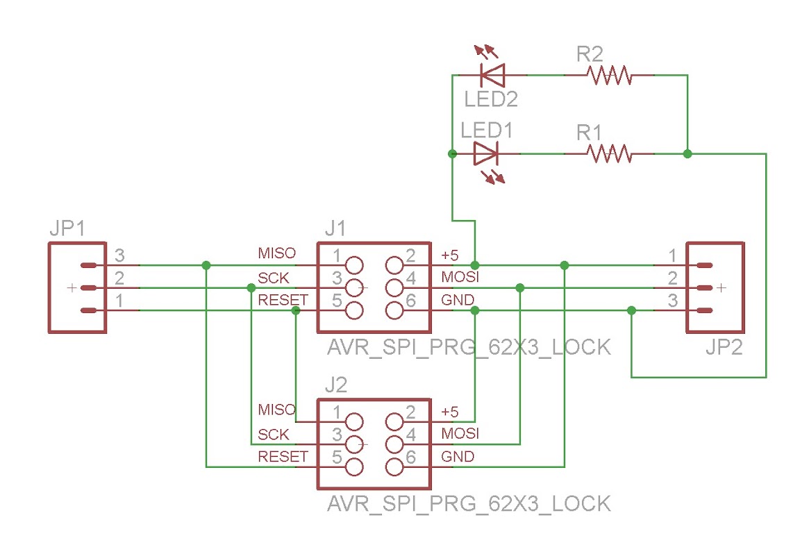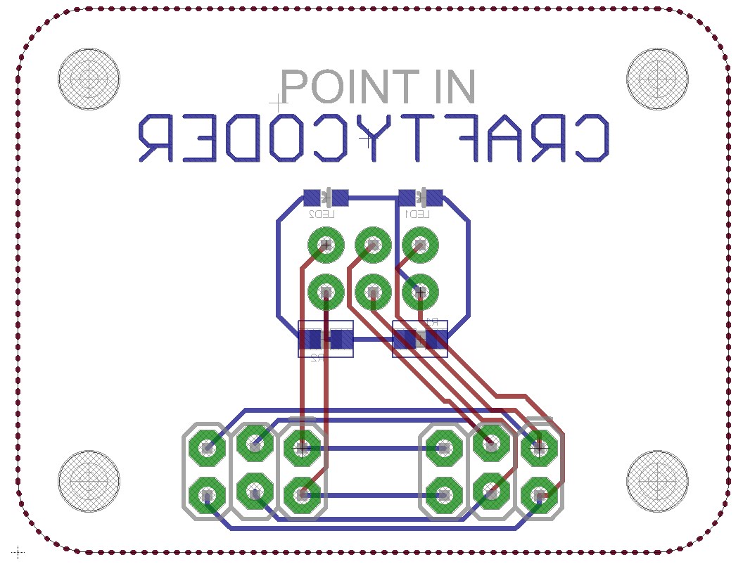 The bells and whistles I spoke of are a pair of ISP headers which are mirror images of each other and a pair of LEDs that point to the #1 pin. When you plug into one the of the two headers, one of the two LEDs lights up pointing to the #1 pin. This function makes it easy to identify how to orient the PCB to the jig.